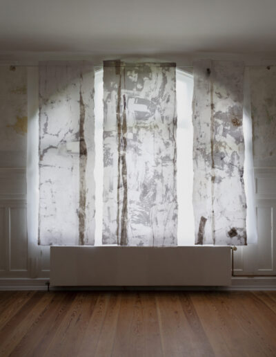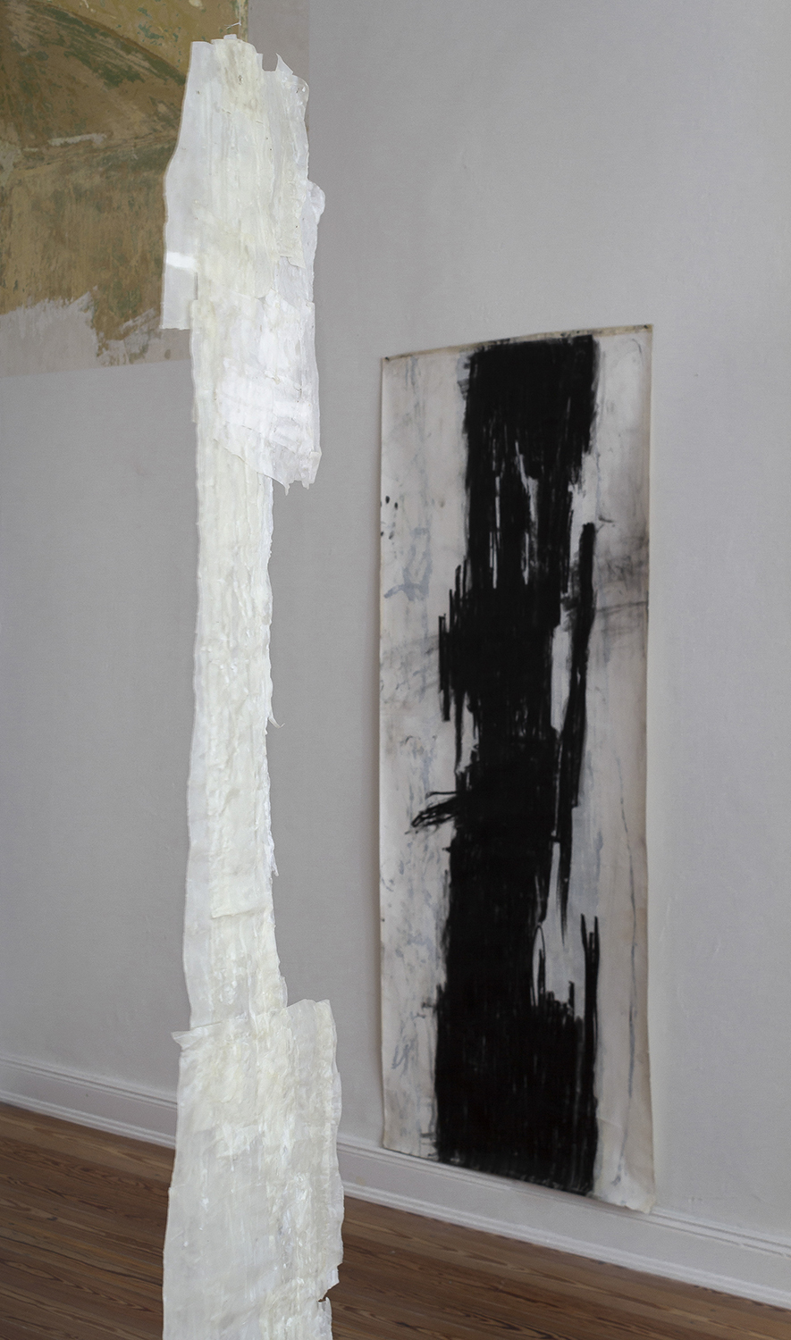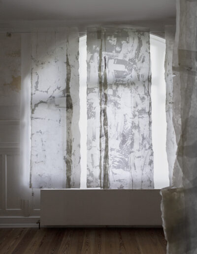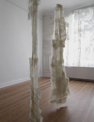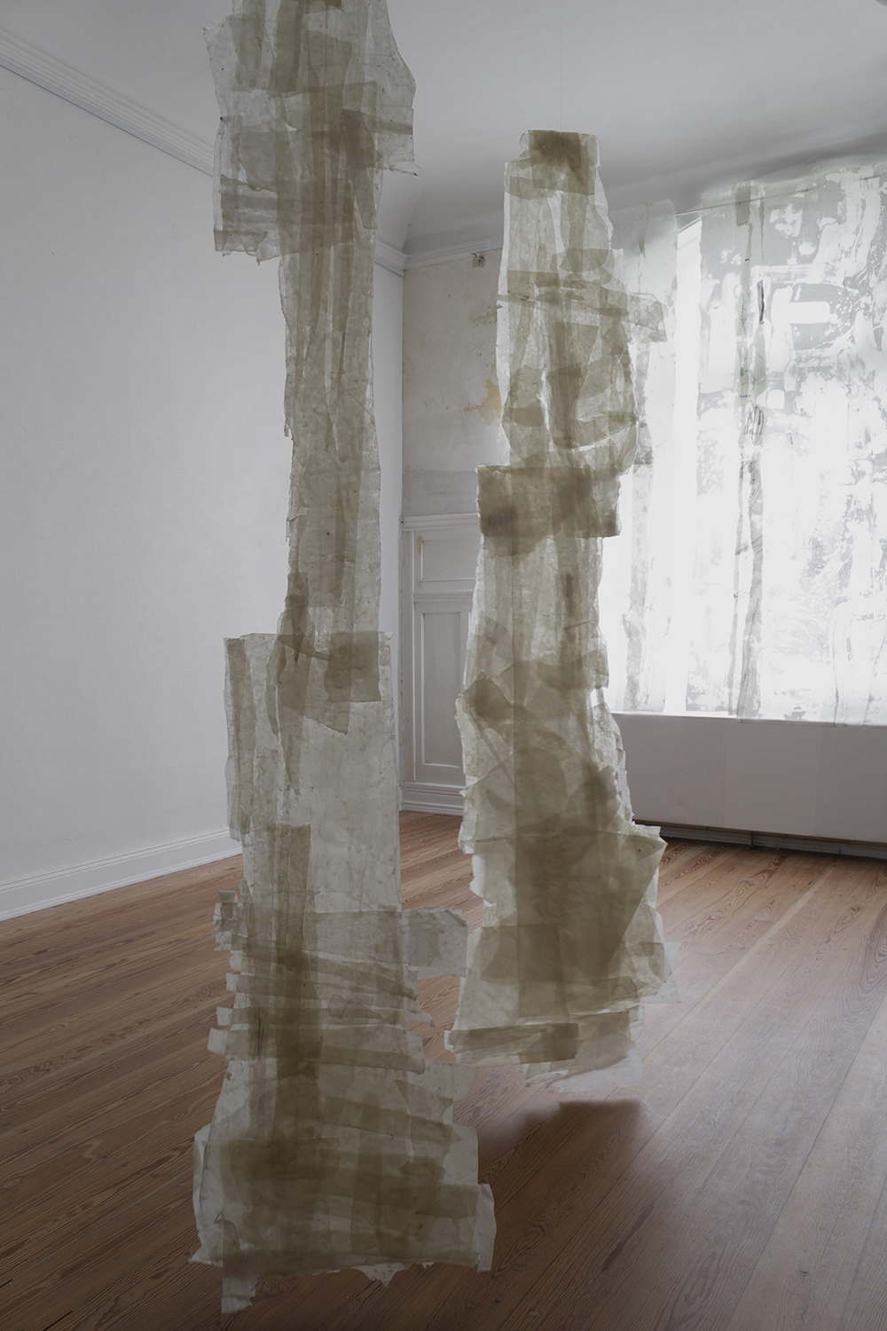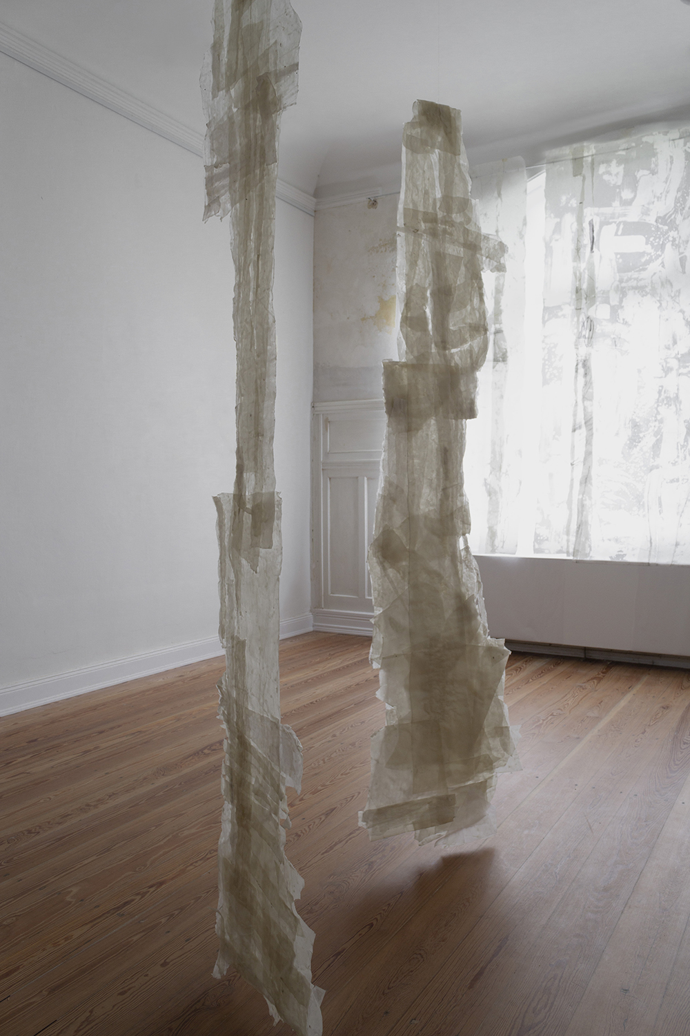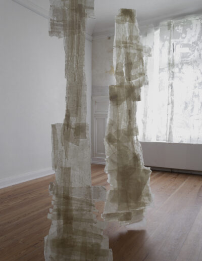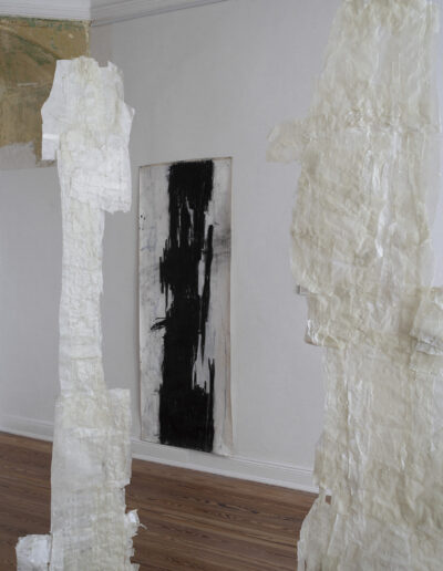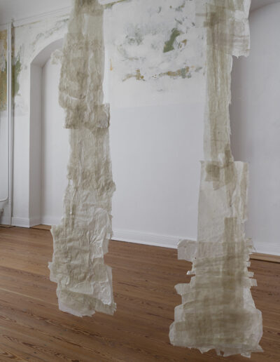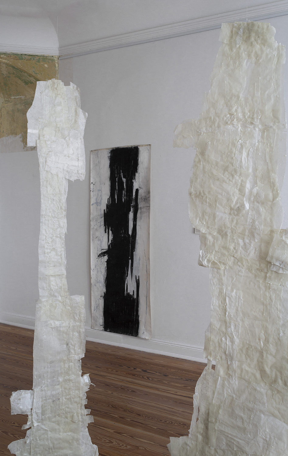 PAARE Spuren von vorgefundenen, jeweils paarweise gespachtelten Stellen an der Wand der Halle waren Ausgangspunkt für eine zunächst zeichnerische und malerische Annäherung. Die dreidimensionale Umsetzung mit unterschiedlichen transparenten, teils bemalten Papieren, schichtweise geklebt, genäht und gefaltet, lässt Assoziationen zu Röntgenbildern entstehen. Diese treten mit den Bildern an den Wänden unberechenbar und geheimnisvoll in Beziehung.