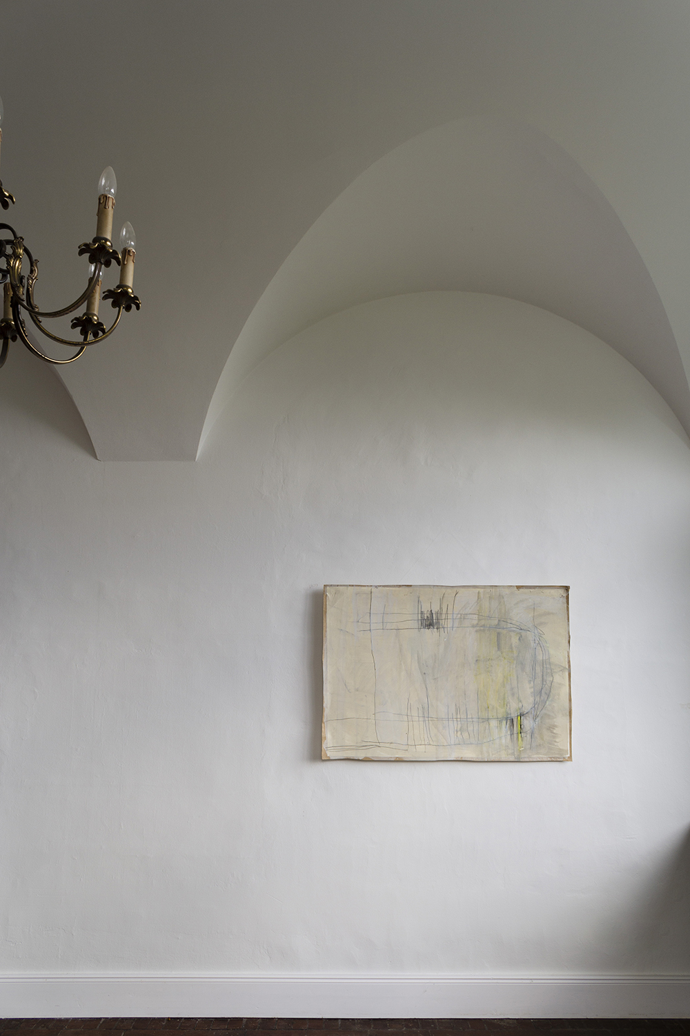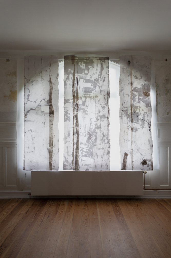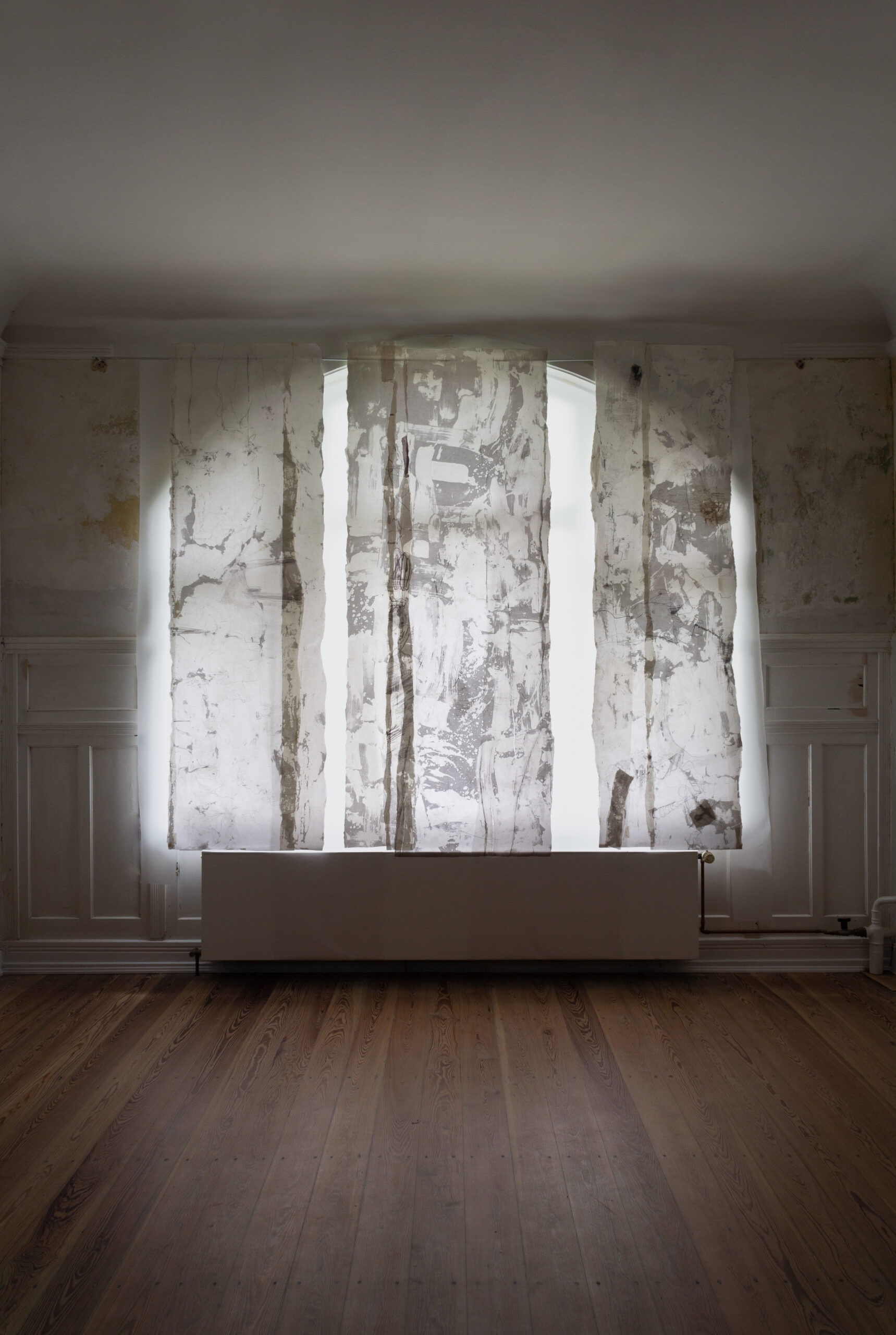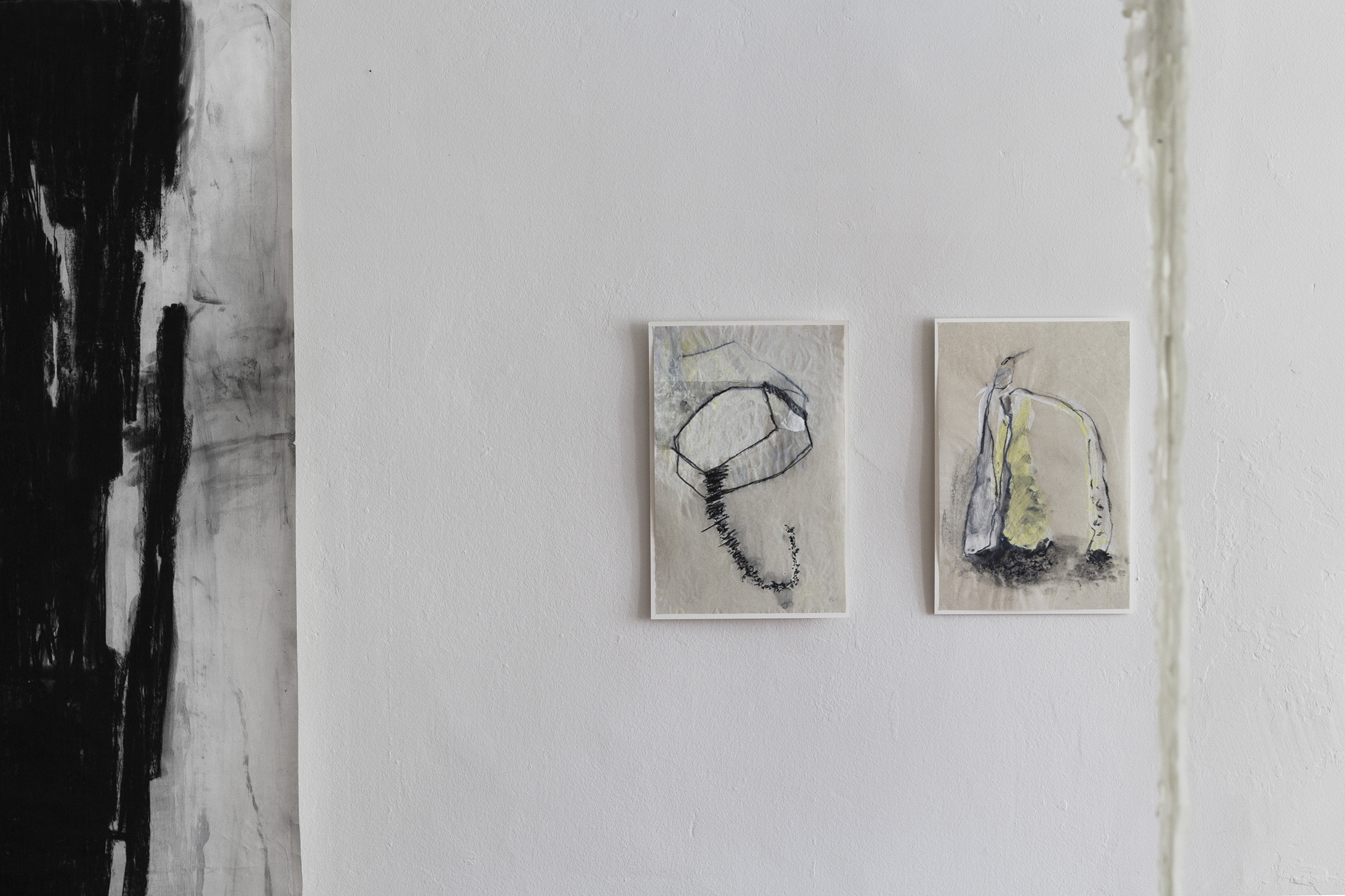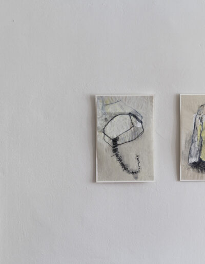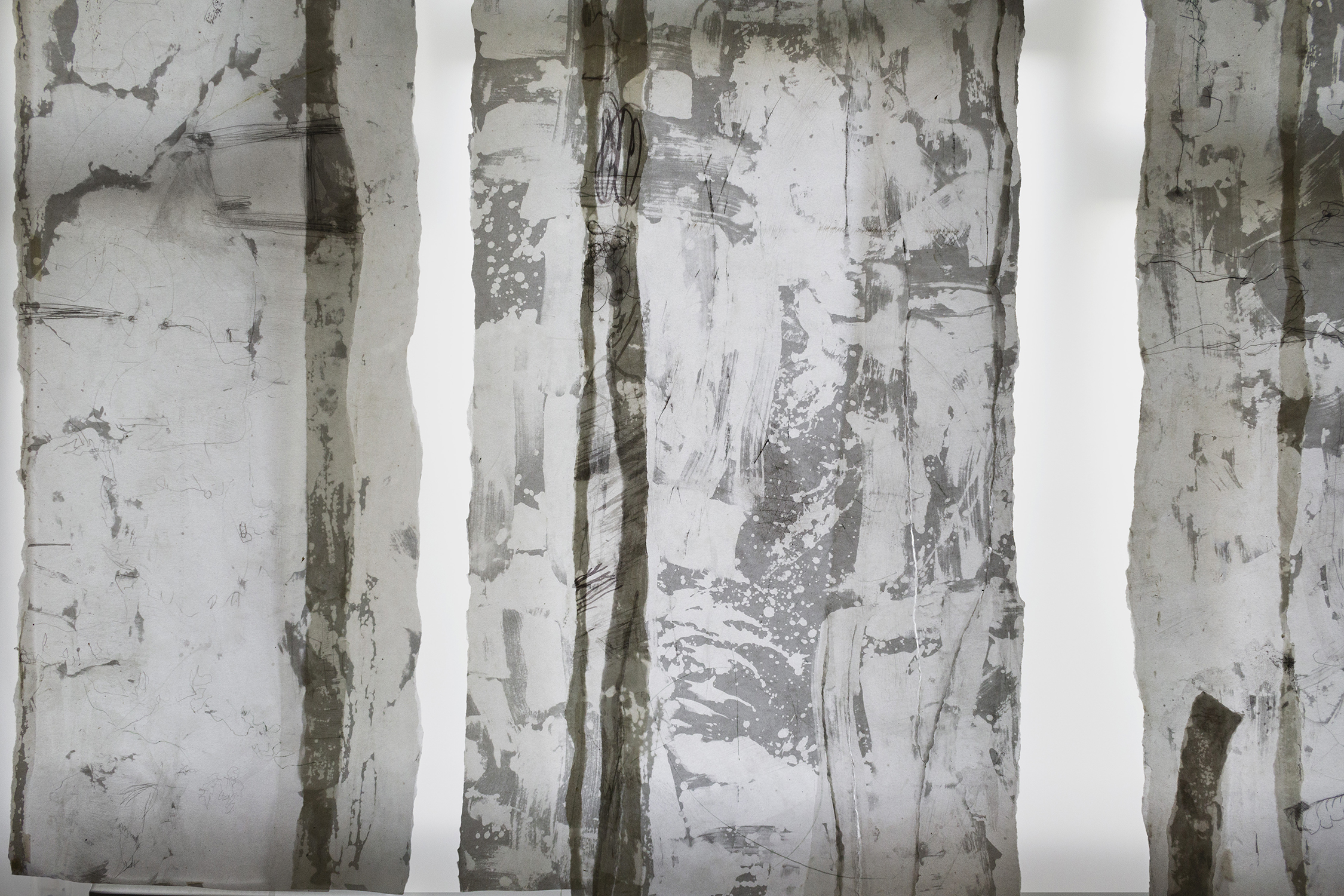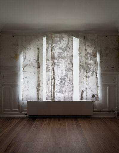 PAARE Spuren von vorgefundenen, jeweils paarweise gespachtelten Stellen an der Wand der Halle waren Ausgangspunkt für eine zunächst zeichnerische und malerische Annäherung. Die dreidimensionale Umsetzung mit unterschiedlichen transparenten, teils bemalten Papieren, schichtweise geklebt, genäht und gefaltet, lässt Assoziationen zu Röntgenbildern entstehen. Diese treten mit den Bildern an den Wänden unberechenbar und geheimnisvoll in Beziehung.