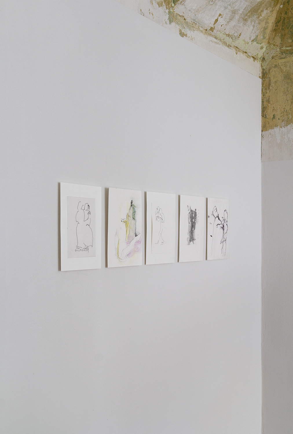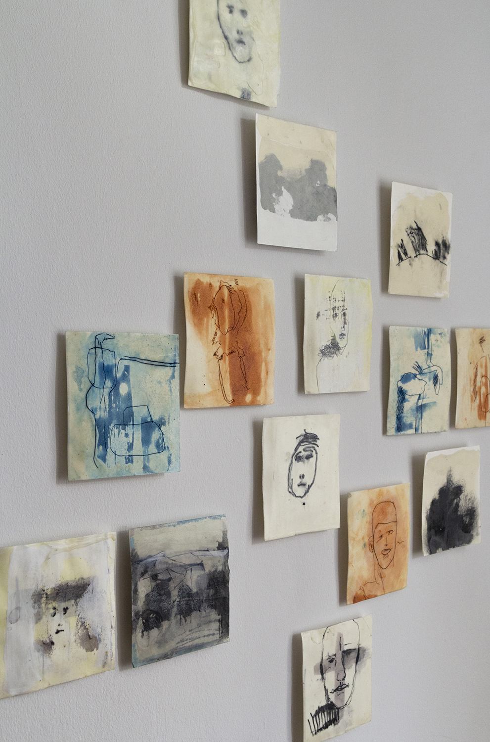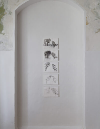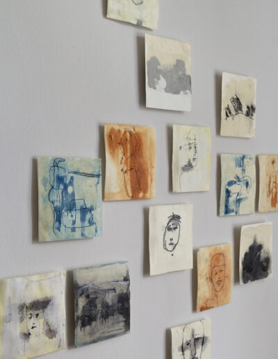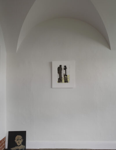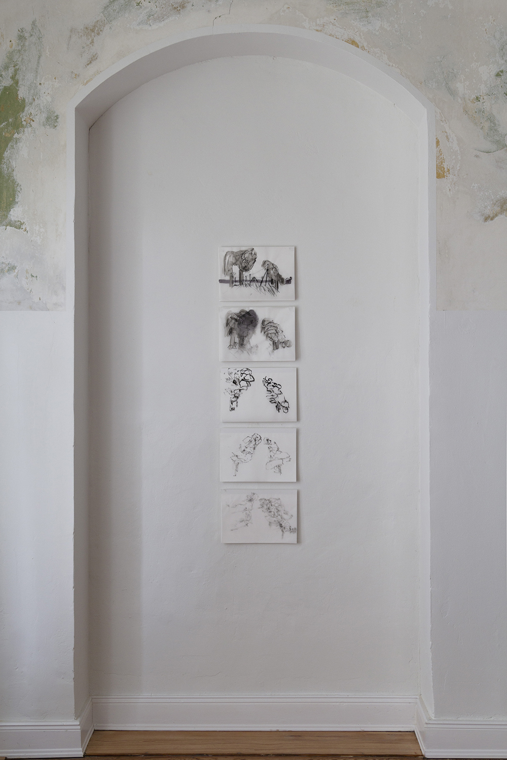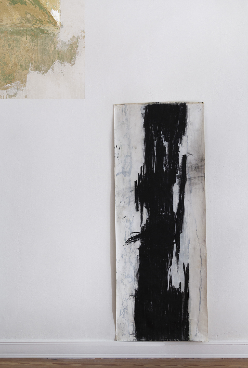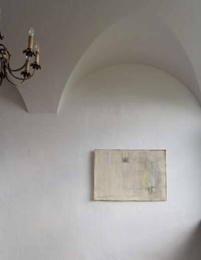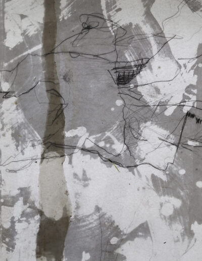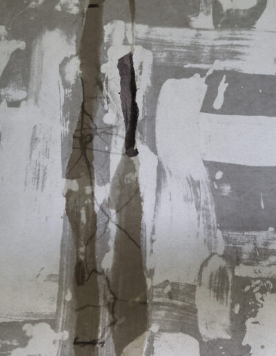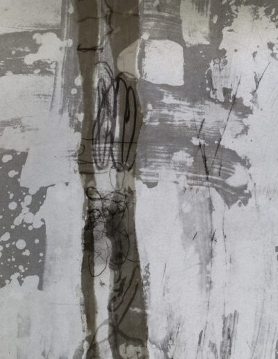 PAARE Spuren von vorgefundenen, jeweils paarweise gespachtelten Stellen an der Wand der Halle waren Ausgangspunkt für eine zunächst zeichnerische und malerische Annäherung. Die dreidimensionale Umsetzung mit unterschiedlichen transparenten, teils bemalten Papieren, schichtweise geklebt, genäht und gefaltet, lässt Assoziationen zu Röntgenbildern entstehen. Diese treten mit den Bildern an den Wänden unberechenbar und geheimnisvoll in Beziehung.