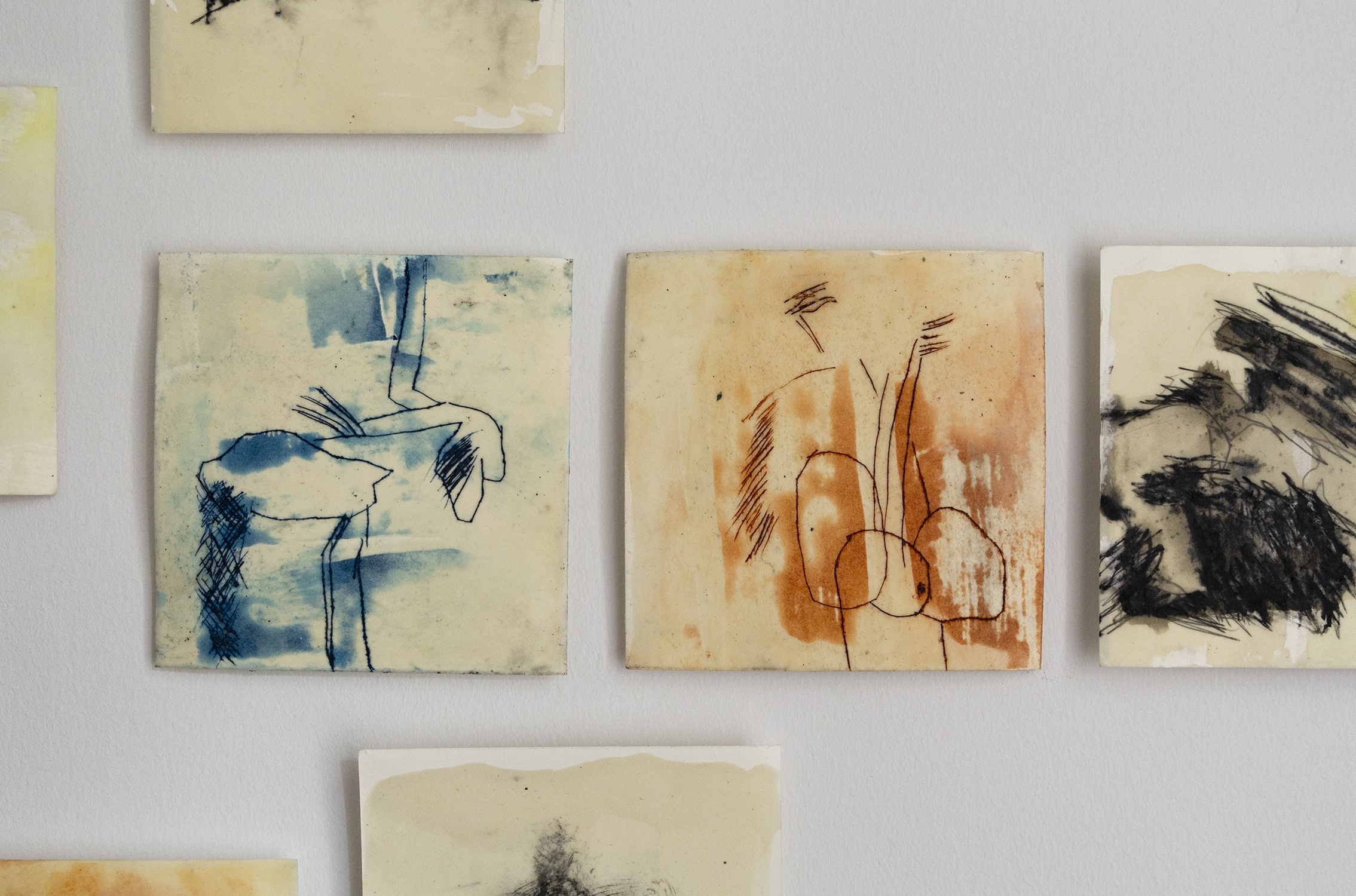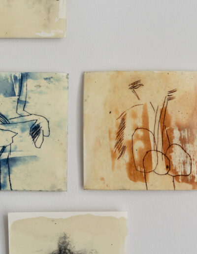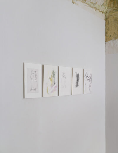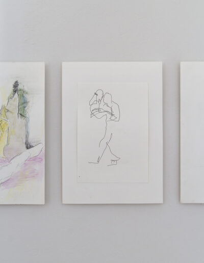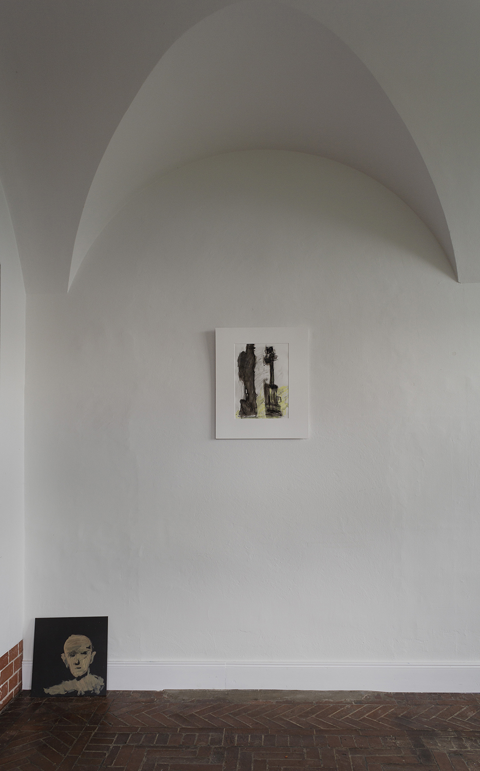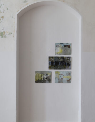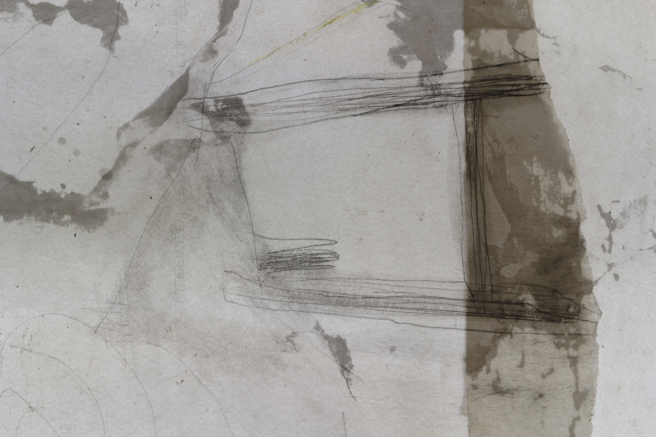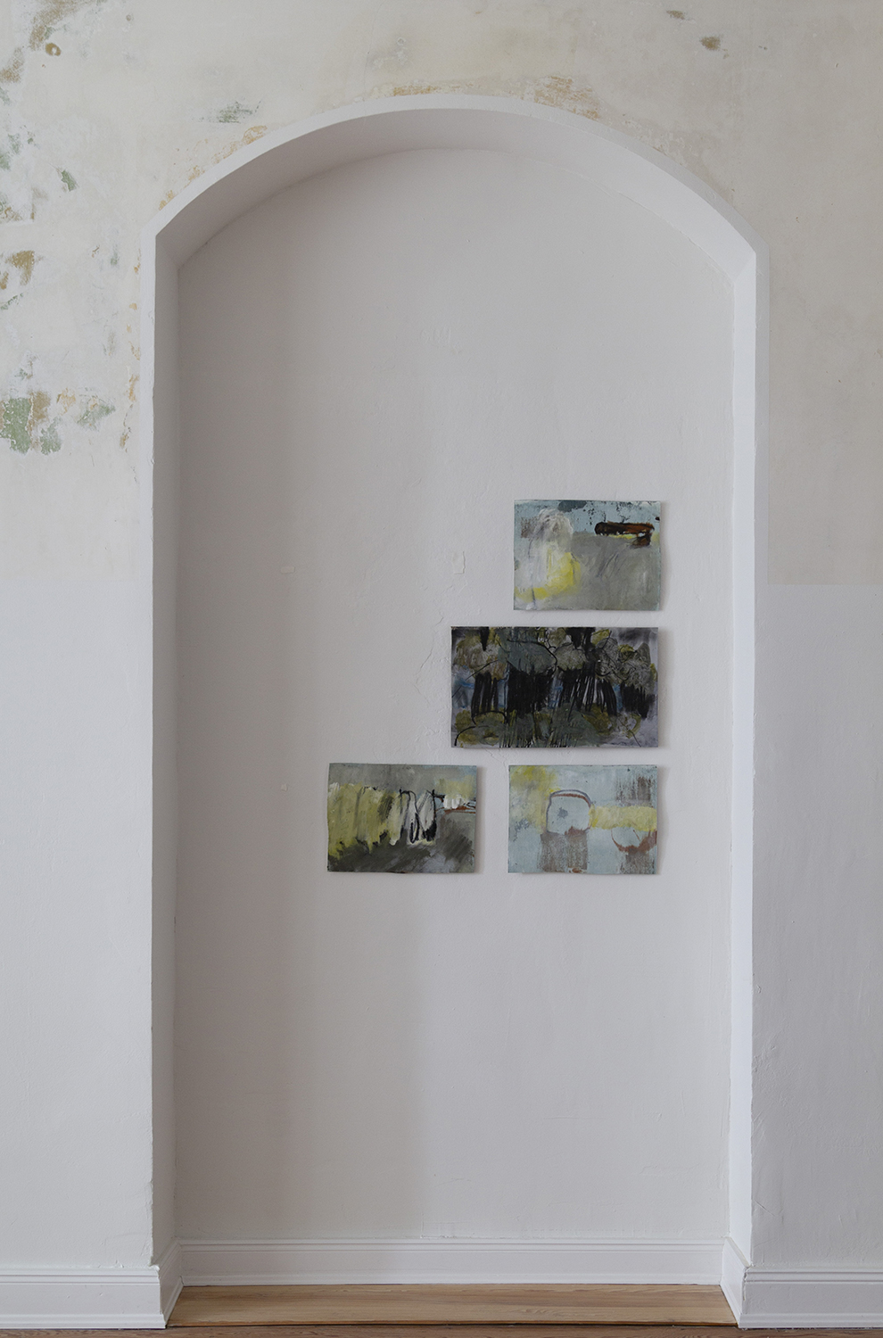 PAARE Spuren von vorgefundenen, jeweils paarweise gespachtelten Stellen an der Wand der Halle waren Ausgangspunkt für eine zunächst zeichnerische und malerische Annäherung. Die dreidimensionale Umsetzung mit unterschiedlichen transparenten, teils bemalten Papieren, schichtweise geklebt, genäht und gefaltet, lässt Assoziationen zu Röntgenbildern entstehen. Diese treten mit den Bildern an den Wänden unberechenbar und geheimnisvoll in Beziehung.