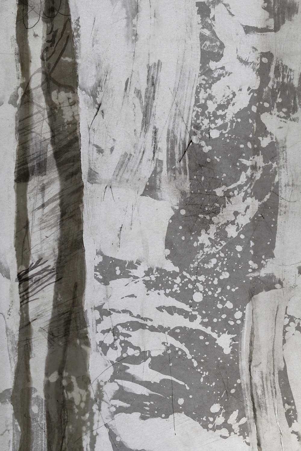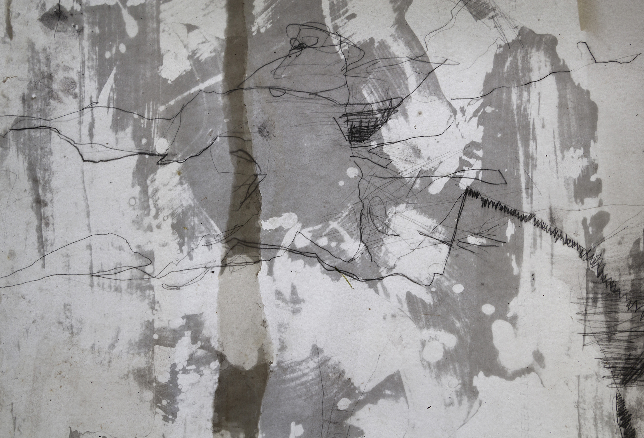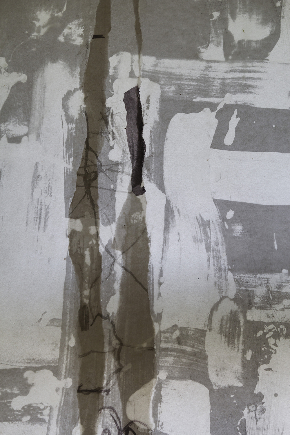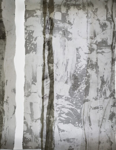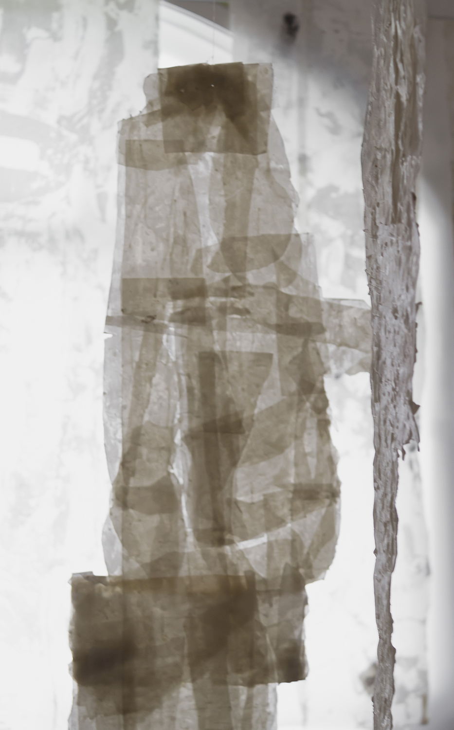 MÄANDERN Spuren von vorgefundenen, jeweils paarweise gespachtelten Stellen an der Wand der Halle waren Ausgangspunkt für eine zunächst zeichnerische und malerische Annäherung. Die dreidimensionale Umsetzung mit unterschiedlichen transparenten, teils bemalten Papieren, schichtweise geklebt, genäht und gefaltet, lässt Assoziationen zu Röntgenbildern entstehen. Diese treten mit den Bildern an den Wänden unberechenbar und geheimnisvoll in Beziehung.